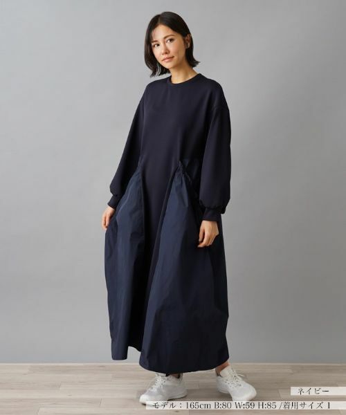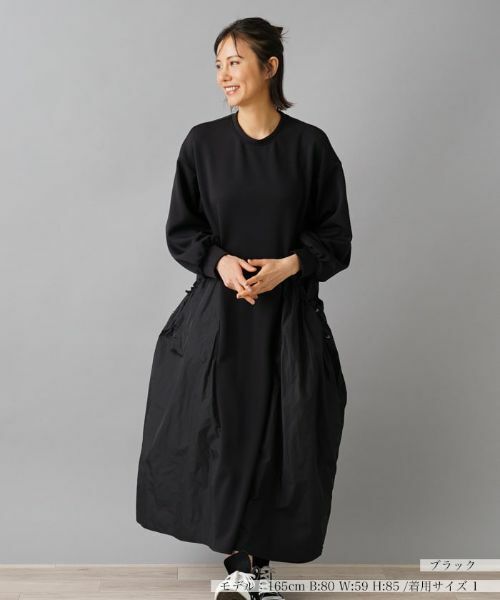 編地と織地の異素材を巧みに組み合わせた、ユニークなデザインのバルーンワンピース。たっぷりと施されたギャザーがボリューム感のあるシルエットを生み出し、さりげなく大人の可愛らしさを演出。身体のラインを拾いにくく、ゆったりと着こなせるので体型カバーもバッチリ。カジュアルな日常使いから週末のちょっとしたお出かけまで、幅広いシーンでフレキシブルに活躍する一枚です。ポケットはドロストにより調節が可能。