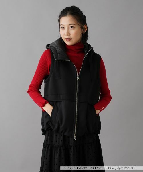 カジュアルさとモード感を兼ね備えたデザインが特徴のフード付きベスト。ダブルジップ仕様で、フロント部分の開閉が簡単にでき、インナーに合わせたスタイリングアレンジが楽しめます。程よくボリュームのあるシルエットが、コーディネートに立体感をプラスしつつ、トレンド感のある表情に。フードが付いているので、軽い羽織としても使いやすく、季節の変わり目や肌寒い時期に活躍するアイテムです。裾のドロストコードで調整が可能です。