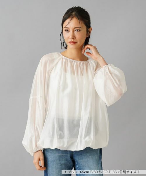 微細な光沢を湛える、薄手のシアー素材で仕立てたバルーンブラウス。全体にギャザーを施し、ふんわりと膨らむような軽やかなシルエットを生み出しています。裾、袖口はゴム仕様で心地よくフィット。カジュアルな日常使いから週末のおでかけまで、幅広いシーンで活躍間違いなし。優雅なスタイリングが手軽に楽しめるトップスです。バックネックの涙あきはボタン開閉が可能。