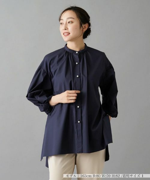 ゆったりとしたドロップショルダーで仕上げた、クロップド丈のボリュームスリーブが特徴のバンドカラーブラウス。コットンにポリエステルをブレンドした、柔らかな光沢を放つ上品な風合いの生地を使用しています。全体にギャザーを施すことで柔らかな表情をもたせ、裾には深めのサイドスリットを入れ、絶妙なバランスの抜け感を生み出しています。フロントにはパール調ビジューのボタンが煌めきを放ち、さりげないアクセントをプラス。落ち着いたシックな色合いでコーディネートに取り入れやすい一枚です。