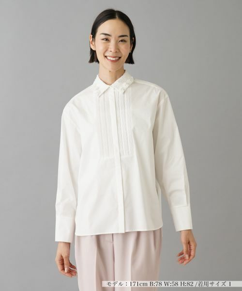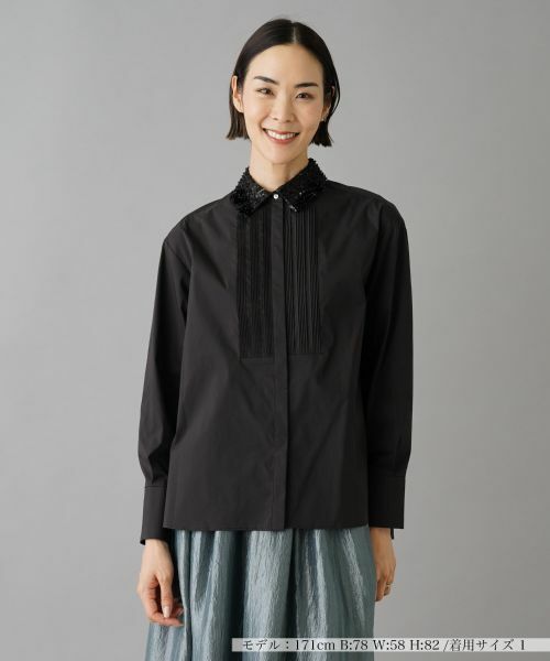 襟にあしらわれたスパンコールやフリンジ使いに個性が光るブラウス。フロントのタックで、ちょっとフレンチシックな雰囲気も可愛らしいポイントです。レディなこだわりがつまった仕立てです。