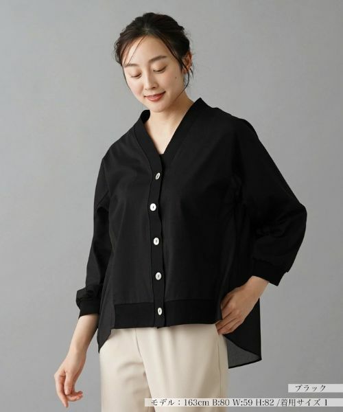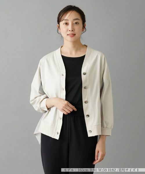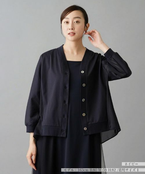 柔らかなコットンニットに、薄手のシアーな素材を組み合わせることで、涼やかなニュアンスを醸し出したカーディガン。クロップドスリーブがさりげなく軽快な印象を与えます。フロントには貝調ボタンをあしらい、細部までエレガントなエッセンスをプラス。ヘムラインは後ろ裾をやや長めに設定しており、ヒップまですっぽりと隠れる程度の丈感でナチュラルに体型カバーできるのも嬉しいポイント。お手持ちのインナーに重ねるだけで、技ありのレイヤードコーディネートが完成します。