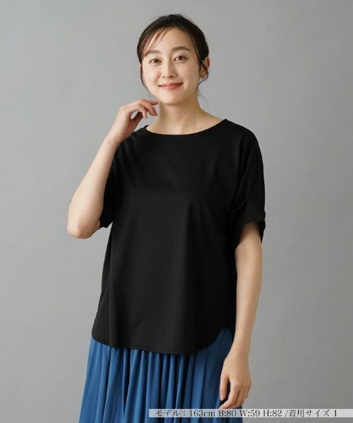 ヘルシーなデコルテ見せを叶えるラウンドネックカットソー。ポリエステルにレーヨンをブレンドした、薄手の柔らかな肌触りの生地を使用しています。ドロップショルダーでゆとりをもたせ、ややルーズな雰囲気に仕上げ、肩肘張らないリラクシーな着心地を実現しました。ヘムラインはラウンドカットで絶妙なバランスの抜け感を作り出しています。シンプルなカラーリングで様々なボトムスとコーディネートしやすく、着回し力に優れたトップスです。