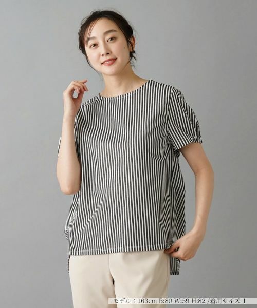 レトロテイストのシンプルなストライプが彩るクルーネックプルオーバー。ポリエステルにコットンをブレンドした、爽やかな薄手の生地を使用しています。膨らみのあるパフスリーブがほんのりと大人の可愛らしさをアピールします。ヘムラインは後ろ裾をややゆったりとさせることで、ヒップまでナチュラルにカバーできるようなシルエットをメイク。すっきりとした細身のパンツとも合わせやすく、オンオフ問わず多彩なシーンで重宝しそうなアイテムです。