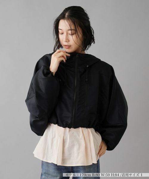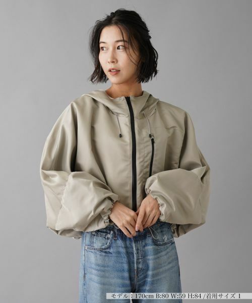 ふんわりとしたレディなシルエットにスポーティな素材が組み合わさったフーディブルゾン。メンズウェアにはないショート丈が可愛らしく、スカートや、ワンピースにぴったりのアイテムです。大き目のフーディでバックシルエットが小さく見えるのも嬉しいポイントです。