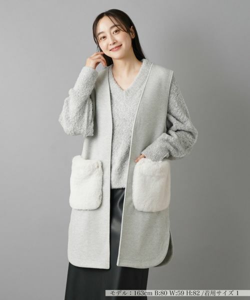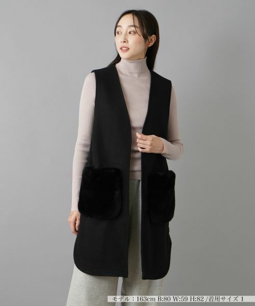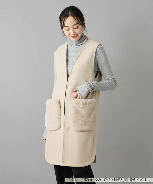 洗練されたデザインながらも大きなポケットがアクセントとなり、トレンド感のあるレイヤードスタイルが叶うベスト。ポケット部分には柔らかいフェイクファー素材が使われており、見た目にも温かみを感じさせます。どんなアイテムにも合わせやすく、上品で落ち着いた印象を演出します。コーディネートは、インナーにタートルネックを合わせたり、パンツスタイルで縦のラインを強調することで、スッキリとしたシルエットに仕上がります。シンプルなデザインだからこそ、アクセサリーや小物で個性をプラスしやすく、秋冬のデイリーに活躍します。フロントホックで開閉可能です。