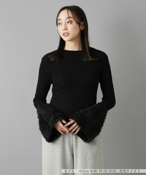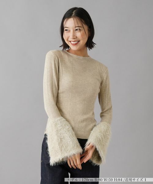 袖口に特徴的なデザインが施されたリブニットトップス。リブ素材が体に程よくフィットし、縦のラインを強調することで、スタイルアップ見せ効果を期待できます。ベルスリーブの袖口はラメ混のシャギー素材に切り替え、シンプルながらも華やかな印象をプラス。裾サイドにはさりげなくスリットをプラス。デニムやカジュアルなボトムスと合わせることで、デイリースタイルにアクセントを加えつつ、エレガントな雰囲気も演出してくれます。