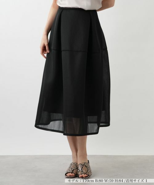 ふんわりと広がるシルエットとシアー素材の切り替えがポイントのフレアスカート。動くたびに揺れる軽やかなシルエットが女性らしさを引き立てます。上品なミディ丈で、カジュアルからきれいめまで幅広いスタイルにマッチ。ハリ感のある生地が立体的なシルエットをキープし、美しいラインを演出します。Tシャツと合わせてカジュアルダウンするのはもちろん、ブラウスやジャケットと組み合わせれば、きちんと感のあるスタイリングにも。デイリーからオフィス、特別なシーンまで活躍する一枚です。後ろファスナーで開閉が可能です。