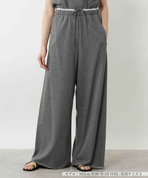 ソフトな肌ざわりの素材が魅力のワイドパンツ。ウエストはゴム+ドロスト仕様で着脱しやすく、締めつけ感の少ない快適な穿き心地が魅力です。たっぷりとしたワイドシルエットが脚のラインを拾いにくく、動きやすさときちんと感を両立。ウエストや後ろの飾りポケットから見える別布がさりげないアクセントに。裾はカットオフデザインで抜け感を添え、サンダルとも相性抜群です。同素材のトップスとセットアップで着こなせば、ワンマイルからお出かけまで活躍します。