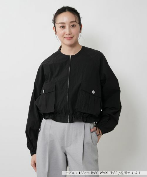 軽やかな素材感が魅力のショート丈ブルゾン。シンプルながらも大きめのフラップポケットがデザインのアクセントとなり、実用性も兼ね備えています。ウエスト部分にはドローストリングが施され、シルエットの調整が可能。袖口はゴム仕様でふんわりとしたボリューム感があり、カジュアルながらも女性らしい印象を演出します。シーズンの変わり目にぴったりな一枚で、デニムやスカートとも相性抜群です。