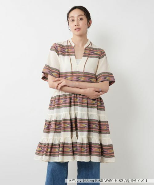 エスニックなムード漂うボーダー柄と、ふんわりと広がるティアードシルエットが魅力のチュニックワンピース。やや立ち上がりのあるネックラインとV字の開きが、顔まわりをすっきり見せてくれます。柔らかな風合いのコットン素材を使用しており、肌離れがよく、春夏のスタイリングに軽やかさを添えてくれる一枚。デニムと合わせてカジュアルに、ワイドパンツとリラックス感のあるコーデもおすすめです。一枚で主役になる存在感のあるデザインで、季節の変わり目にも活躍します。