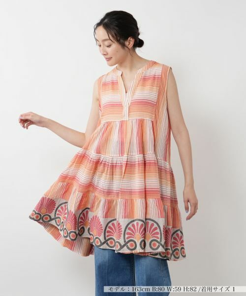 柔らかな陽射しのようなマルチストライプが目を惹く、華やかなノースリーブチュニックブラウス。ふんわりと広がるティアードシルエットが、軽やかな動きを生み、着るだけで気分も華やぐ一枚です。裾に施されたアート感のあるデザインが、全体を引き締めるアクセントに。ネックラインはすっきりとしたスキッパー仕様で、顔まわりをシャープに見せてくれます。デニムを合わせてカジュアルダウンしたり、ワイドパンツで抜け感を楽しむコーデもおすすめ。春夏のリゾートや街歩きにもぴったりな主役ブラウスです。