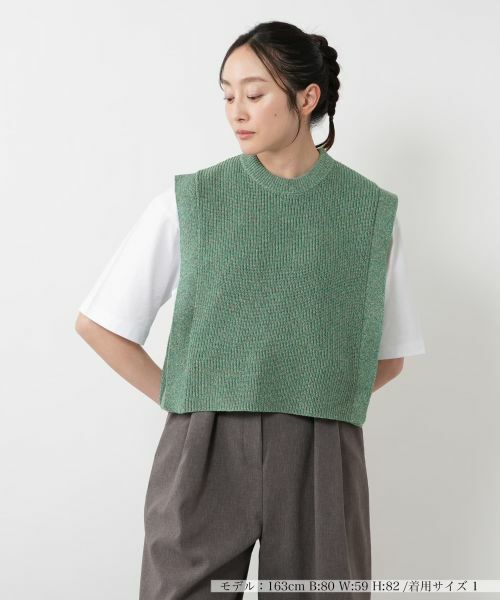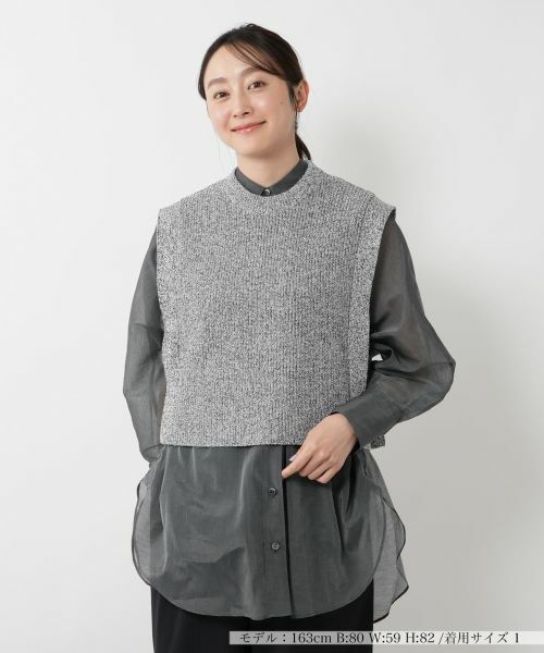 メランジヤーンで編み立てた、表情豊かなニットベスト。やや短めの着丈とストンとしたシルエットが、どんなトップスにも重ねやすく、着こなしに奥行きをプラスしてくれます。肩を包み込む程よい幅感が、気になるラインをカバーしつつ、洗練された印象に。ブラウスやワンピースにレイヤードするだけで、ぐっと今っぽい装いにアップデート。季節の変わり目の体温調節にも重宝する、頼れるプラスワンアイテムです。