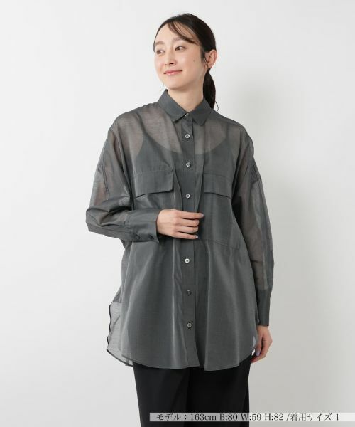 軽やかな透け感とシルク混の上品な素材感が印象的なロングシャツ。胸元の大きめフラップポケットが視線を引き上げ、シンプルながらも洒落感のあるディテールに。程よくゆとりのあるシルエットが体のラインを拾いにくく、動くたびに揺れるニュアンスが魅力です。前後差のある着丈で、アウトスタイルもバランスよく決まり、パンツ合わせはもちろん、羽織りとしても活躍。ニュアンスカラーがコーディネートに柔らかな陰影をもたらし、春夏のワードローブに品よく馴染みます。