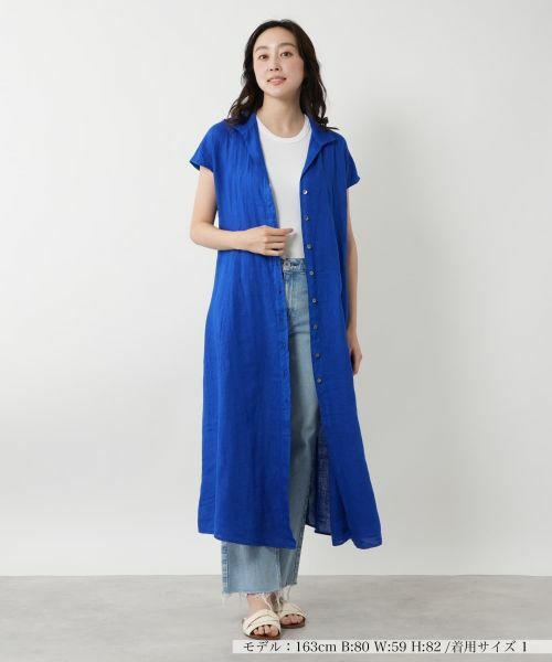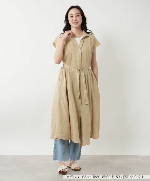 さらりとした風合いが心地よい、軽やかな麻素材のワンピース。すっきりとしたデザインに、ウエストは共布ベルトで調整でき、着こなしに表情を加えてくれます。適度に開いたネックラインはデコルテをきれいに見せてくれ、抜け感をプラス。フレンチスリーブが二の腕をさりげなくカバーしつつ、動きやすさもキープ。ボタンを開けて羽織りとしても活用でき、デニムとのレイヤードもおすすめ。ナチュラルで爽やかな色合いが春夏の空気になじみ、大人のリラックス感を引き立てる一着です。