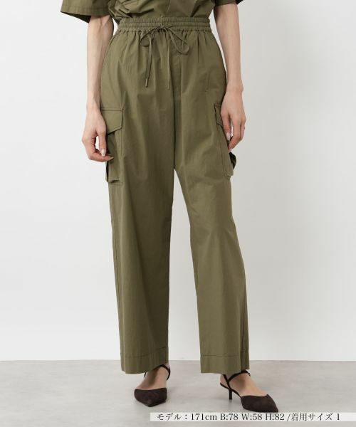 ハリ感のあるコットン素材で仕立てた、ミリタリーテイストのカーゴパンツ。ウエストはゴム+ドローストリング仕様で、リラックスした穿き心地ながら、すっきりとした腰まわりを演出。ワイドシルエットが脚のラインを拾わず、動きやすさも抜群です。サイドポケットのディテールが程よいアクセントになり、カジュアルながらも洗練された印象に。同素材のシャツと合わせて、こなれ感のあるセットアップスタイルも楽しめます。