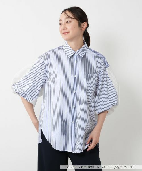 爽やかなストライプ柄に、袖の立体的なフォルムと異素材切り替えが目を惹くモードなブラウス。程よいハリ感のある素材を使用し、シルエットを美しくキープ。ゆとりのあるボリュームスリーブが、腕周りを軽やかに見せながら、着こなしに華やぎを添えます。サイドスリット入りのラウンドヘムで、パンツスタイルにアウトしてもすっきりと決まり、フロントインもバランスよくまとまるデザイン。きちんと感のあるシャツスタイルに遊び心を加えた、大人のための主役トップスです。シンプルなボトムと合わせるだけで、旬の着こなしに。