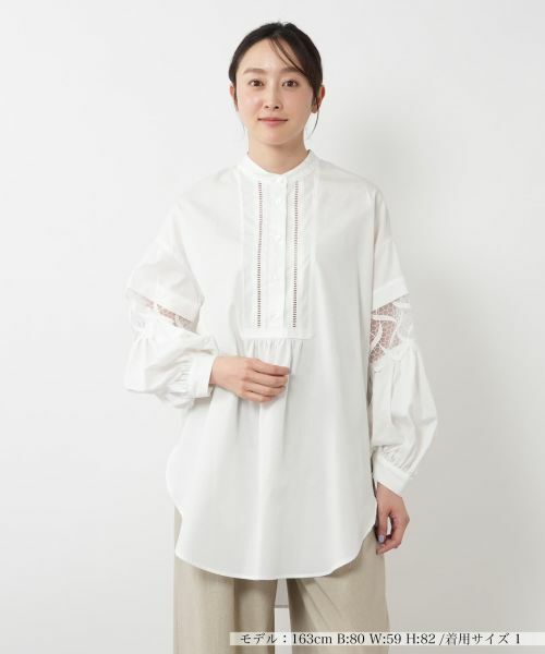 袖にあしらわれた繊細なレースが、上品な華やかさを演出するバンドカラーブラウス。やや長めの丈感とゆったりとしたシルエットで、リラックス感がありつつもきちんと感を両立。肌離れの良い軽やかな素材感で、季節の変わり目にも快適に着用可能。テーパードパンツやスカートと合わせたオンスタイルはもちろん、デニムを合わせたカジュアルな着こなしもおすすめです。袖をくしゅっとまくってこなれ感を出すのも素敵です。