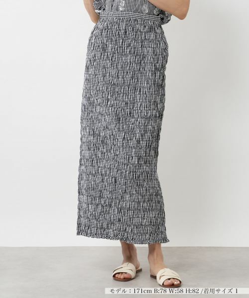 表情豊かなシャーリングが印象的な、ギンガムチェック柄のロングスカート。細かいシワ加工が生み出す立体感と、すっきりとしたIラインシルエットが、大人のカジュアルスタイルに程よい抜け感をプラスしてくれます。ウエストは総ゴム仕様でストレスフリーな着心地ながら、トップスをインすれば腰位置が高く見え、バランスの良い着こなしに。Tシャツやブラウスとの合わせはもちろん、ジャケットに合わたきれいめスタイルもおすすめです。