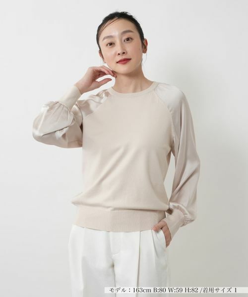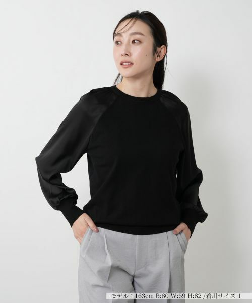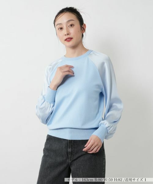 シンプルながらも華やかさを演出する異素材切り替えのトップス。身頃は柔らかく伸縮性のあるニット素材、袖には光沢感のあるサテン生地を使用し、女性らしいエレガントな印象を演出します。ボリュームスリーブのデザインが程よいフェミニンさを加え、カジュアルながらも上品な雰囲気に。デニムと合わせればカジュアルに、タイトスカートなどを合わせればきれいめなスタイルに仕上がるので、オンオフ問わず活躍します。1枚で存在感のある着こなしが楽しめる、大人のこなれトップスです。