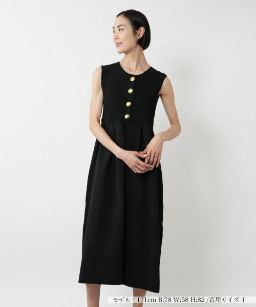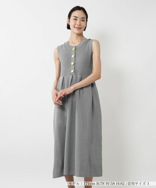 上身頃はリブ編みでフィット感があり、ウエストからふんわりと広がるシルエットが美しい、ノースリーブのワンピース。フロントにあしらわれた大ぶりのゴールドボタンがアクセントとなり、シンプルながらも華やかさを添えます。前後で着用可能なので、気分に合わせてアレンジできるのも嬉しいポイント。上品な色合いで、シーンを問わず活躍する一着。カーディガンやジャケットを羽織れば、お仕事シーンやお食事会などにもおすすめです。シューズや小物で遊びを加えることで、ぐっと今っぽい着こなしに。