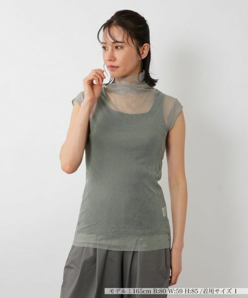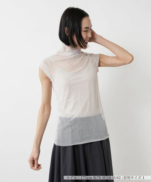 ナチュラルなシワ感のある薄手のシアー素材を使用した、フェミニンな印象のハイネックカットソー。ほんのり透ける生地が軽やかで、上品な大人の女性らしさを演出。すっきりとしたシルエットで着こなしやすく、タンクトップやキャミソールとレイヤードすれば、程よい抜け感のある洗練されたコーディネートに。デニムと合わせてカジュアルに、スカートでエレガントにと、スタイリング次第で表情を変える着回し力の高い一枚です。