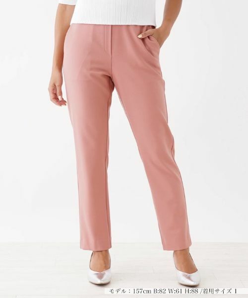 細身のテーパードシルエットが美しいパンツ。レッグラインがスマートに引き立ち、ヘルシーな女性らしい立ち姿を演出。股上をやや深めに設定しつつ、伸縮性のあるゴムウエストで仕上げ、程よいフィット感があり穿き心地も快適です。