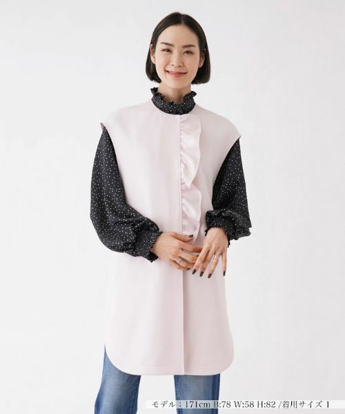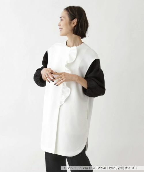 やや肩を覆うようなフレンチスリーブで旬な雰囲気をキャッチした、ノーカラーのロングベスト。フロントには立体感のあるラッフルフリルをアシンメトリーにトッピングし、可愛いエッセンスをオン。フロントはボタンを留めても開けてもサマになり、お好みに合わせてコーディネートのアレンジが楽しめます。春夏シーズンのスタイルのプラスワンにぴったりのトップスです。
