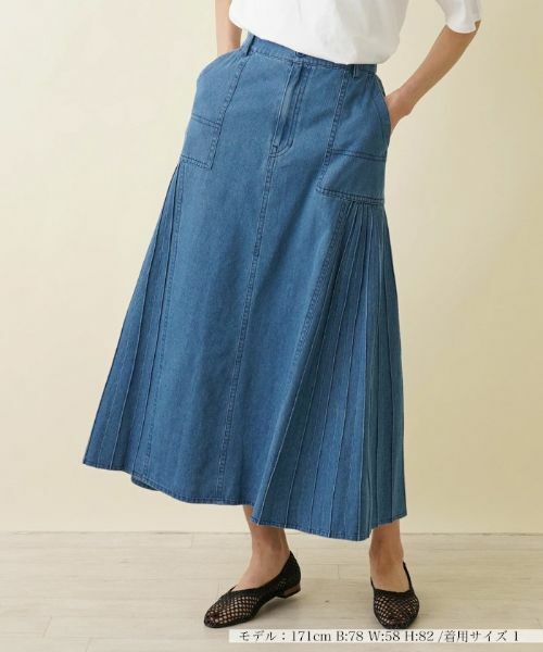 ポケットやサイドの巧みなタック&切り替えが技ありのデニムロングスカート。バックウエストはゴム仕様で適度なフィット感をもたせ、はき心地も快適。デニムの気取らない雰囲気はそのままに、シンプルなトップスとコーディネートするだけでもファッション感度高めの大人カジュアルスタイルが楽しめるアイテムです。