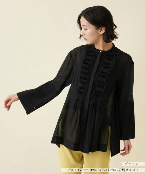 細かなタックプリーツ加工を施したフロントデザインがエレガントな表情を見せてくれるブラウス。程よいシアー感のある生地を使用したシャイニーな風合いが春夏らしい爽やかなムードに。バンドカラーに、フロントは比翼仕立てですっきりとさせ、タックプリーツを際立たせるシンプルな仕様に。裾のサイドスリットやロングカフスなど、ディテールにこだわったアイテムです。
