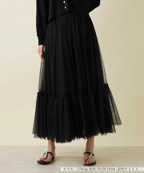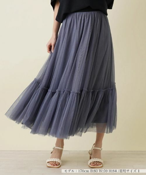 動きに合わせてふわふわとエアリーに揺らめくチュール素材を重ねたロングスカート。裾部分の切り替えにたっぷりとギャザーを施したボリュームのあるデザインで、華やかさをプラス。ウエストは総ゴム仕様でリラクシーに穿けるのも魅力。スイートな着こなしにはもちろん、あえてTシャツ等でカジュアルに着崩してもお洒落なアイテムです。足元は抜け感たっぷりのサンダルなどを合わせれば、シーズンライクな着こなしが楽しめます。