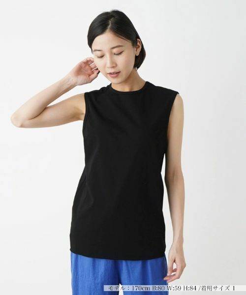 浅めのクルーネックで品よく仕上げた、ノースリーブカットソー。適度にフィット感のあるシルエットが美しい、キレイめに装えるアイテムです。裾はカットオフで軽やかな雰囲気に。シンプルなデザインなので、アクセントになる柄やカラーパンツを合わせたり、シフォンスカートなど軽やかさのあるアイテムとのコーデもおすすめです。首元にネックレスやスカーフなどを合わせれば、華やかな雰囲気に仕上がります。
