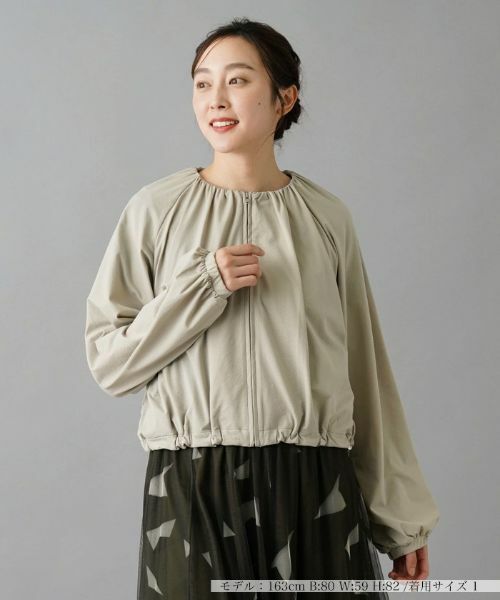 こなれた雰囲気で着こなせる、カジュアルなノーカラージャケット。全体にギャザーを施すことで柔らかなニュアンスを生み出しました。フロントジップアップ仕様でスムーズに着脱が行えます。やや薄手の生地はナイロンにストレッチ素材を混紡しており、肌当たりもよく、ストレスフリーの着心地を実感できます。やや短めの丈感なのでロングスカートやワンピースとのコーディネートもバランスよく決まります。袖口はゴム仕様で心地よくフィットし、裾はドローコードにより調整が可能。