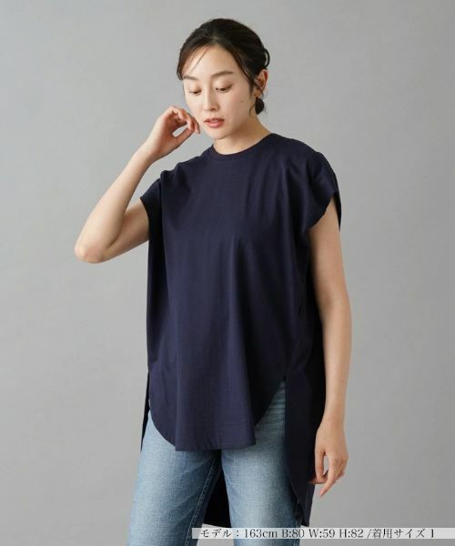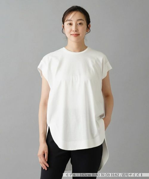 シンプルなフロントデザインと背面に施されたプリーツディテールが特徴のバックコンシャスなトップス。カジュアルながらも洗練されたデザインが魅力のアイテムです。浅めのネックラインとフレンチスリーブが顔周りをすっきりと見せてくれます。前後差のあるラウンドヘムにサイドスリットを入れ、軽やかさをプラス。ソフトで肌触りの良い素材を使用しているため、着心地も快適です。ヒップラインがすっぽりと隠れるデザインなので、パンツとも相性が良く、デイリーユースからオフィスカジュアルまで幅広く活躍します。
