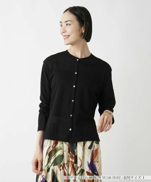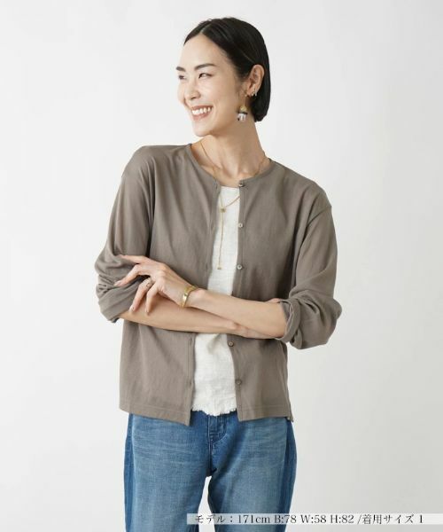 コットンにナイロンをブレンドして優しく編み込んだ、薄手のクルーネックニットカーディガン。首周りに沿うような浅めのネックラインが上品かつ落ち着いた佇まいを演出。フロントには貝調ボタンがきらりと光り、さりげなくこだわりを感じさせるエッセンスに。裾にはサイドスリットを入れ、絶妙なバランスの抜け感を作り出しています。やや短めの丈感なのでボトムスの存在感が際立ち、スタイリッシュな印象のコーディネートに仕上がります。