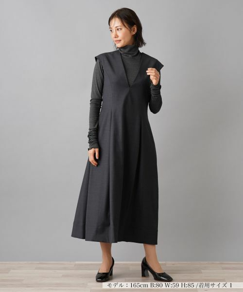 シンプルながらも洗練されたデザインが特徴で上質なウール混素材で仕立てられたエレガントなワンピース。前後の深めのVネックラインが、顔まわりをシャープに引き立て、大人の女性らしい印象を演出。パネルラインの切り替えにより、女性らしい自然なシェイプを作り出し、裾に向かって緩やかに広がるコクーンシルエットが美しい動きを生み出します。ラメ入りのカットソーやタートルネックと合わせた華やかさのあるカジュアルスタイリングがオススメです。ドレープ感と適度なフィット感を併せ持つデザインは、デイリーから特別な場面まで、幅広く活躍します。バックファスナーで開閉が可能です。