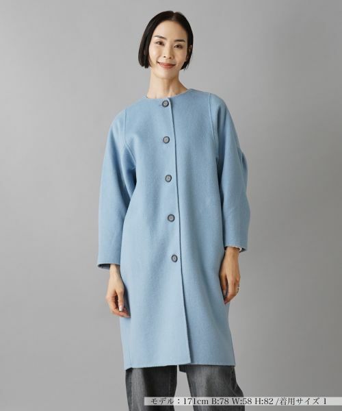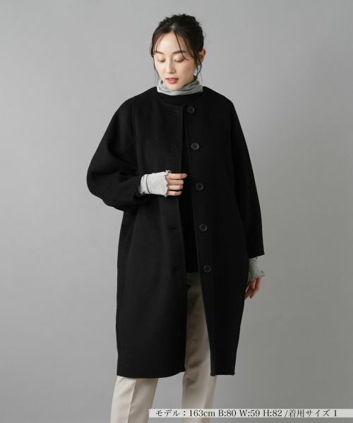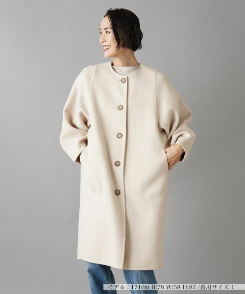 上品で洗練されたデザインが魅力のノーカラーコート。ゆったりとしたシルエットで、体型を問わずスタイリッシュに着こなせます。ノーカラーに大きめのボタンがアクセントとなり、シンプルながらもおしゃれな印象を与えます。後ろの袖部分にはたっぷりとギャザーを入れ、ボリューム感をもたせました。両サイドにポケットがあり、実用性も兼ね備えたデザインです。タートルネックやハイネックなどのインナーを合わせれば季節感のあるレイヤードスタイルが完成します。