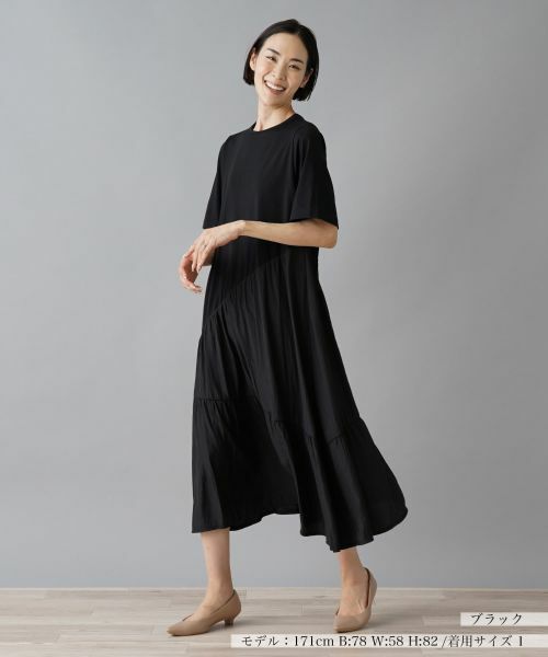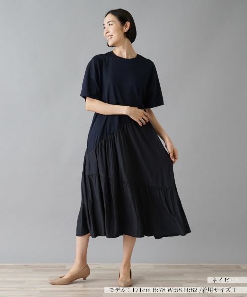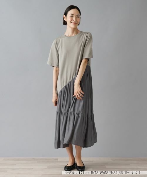 アシンメトリーな異素材切り替えがポイントになった、フレアワンピース。ギャザーをたっぷりと施すことで、流れるような柔らかなニュアンスに。ネックラインは浅めに設定し、上品かつ落ちついた佇まいを演出。ゆったりとしたボリューム感のあるシルエットでヒップまで包みこんでくれるので体型カバーもお手のものです。足元はパンプスはもちろん、サンダルでまとめても開放的なムードを漂わせるリゾートライクなスタイルが完成。