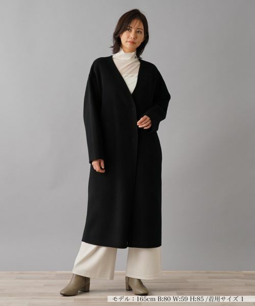 ミニマルなデザインが洗練された印象のノーカラーのVネックロングコート。シャープなネックラインが絶妙な抜け感を生み出します。ドロップショルダーで程よいリラックス感をもたせ、エフォートレスな雰囲気のシルエットを構築。ウエスト両サイドにスリットポケットをバランスよくレイアウトしており、フロントはスナップボタンにより開閉が可能。オンオフのシーンを選ばずフレキシブルに活躍するアウターです。