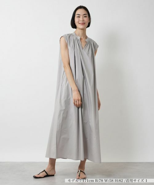 シンプルながらも洗練されたデザインのロングワンピース。すっきりとしたVネックが顔周りをシャープに見せてくれる。ゆったりとしたシルエットで、リラックスした着心地が特徴。