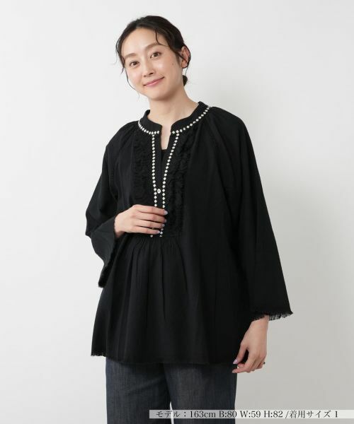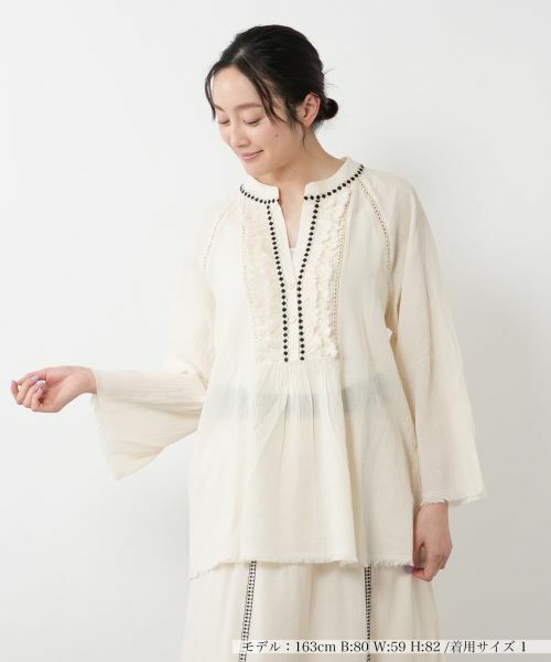 繊細な刺繍ディテールと、裾や袖口にあしらわれたフリンジが軽やかなアクセントを添えるコットンブラウス。ナチュラルな風合いの素材に、配色ステッチが映え、甘すぎず大人の女性に似合う一枚に仕上がっています。ゆとりのあるシルエットは涼やかで動きやすく、これからのシーズンに大活躍。ふわりと広がるフレアスリーブが手元に華やかさを演出し、ボトムを選ばず着こなしの幅が広がります。リラックス感と品の良さを兼ね備えた、デイリーに頼れる一着です。