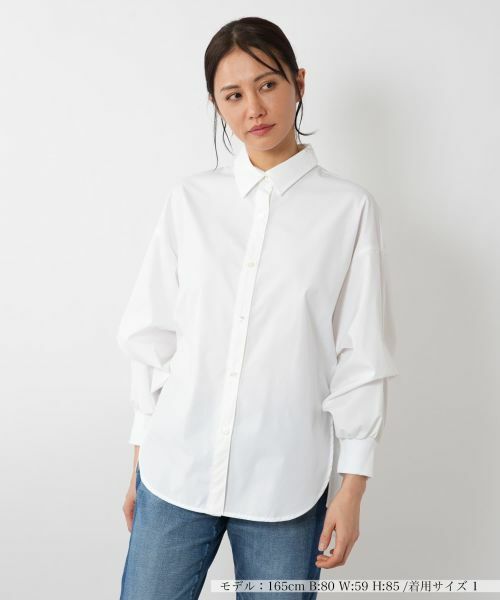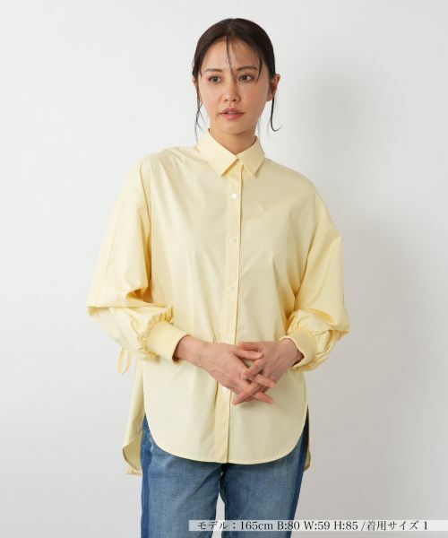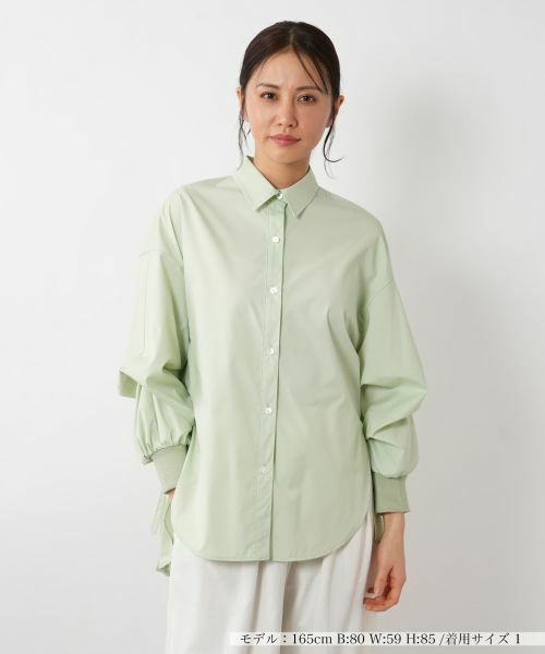 バックスタイルにプリーツを施したデザイン性の高いシャツ。フロントはシンプルなシャツデザインながら、後ろに向かって広がるプリーツが華やかな印象をプラスします。軽やかな生地感で、動くたびにふんわりと揺れるシルエットが魅力的。ボリュームのある袖にはリブカフスを採用し、メリハリのあるシルエットを実現。スリーブの内側にはボタンが付いており、フォルムを変えられるのも嬉しいポイント。パンツにもスカートにも合わせやすく、シンプルながらもコーディネートに個性を加えたいときにぴったりな一枚です。