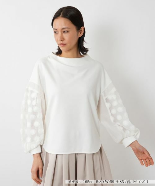 袖にあしらわれたドットチュールがフェミニンなアクセントを加えるプルオーバー。ボディ部分はシンプルなデザインで、柔らかなカットソー素材を使用し、快適な着心地を実現しました。程よくゆとりのあるシルエットが女性らしい抜け感を演出し、デニムやスカートとも好相性。袖口はリブ仕様になっており、程よいフィット感と動きやすさも兼ね備えています。カジュアルながらも上品さをプラスした一枚で、デイリーコーデを華やかにアップデート。