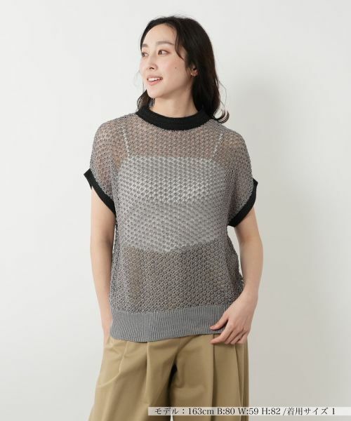 繊細な透かし編みと、ネック・袖口の配色ディテールが印象的なニットトップス。ふんわりとした軽やかな編地が、空気をまとうような着心地を叶えます。インナー次第で表情が変わるため、シンプルなタンクトップを重ねたり、ワンピースとレイヤードしても素敵です。裾リブがさりげなく腰まわりを引き締め、ボリュームボトムともバランスよくまとまります。春夏の軽快な着こなしに、季節感と抜け感を添えてくれる一枚です。背中のループボタンで開閉が可能です。