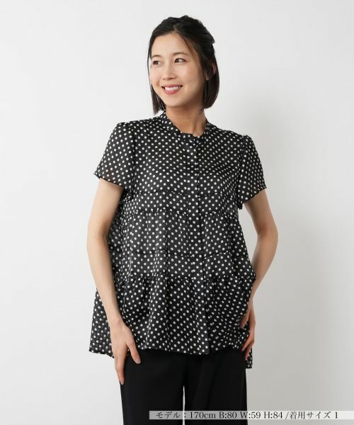 クラシカルなドット柄に、ティアードデザインで動きを加えたレディライクなブラウス。シアー感のある軽やかな素材が、ふんわりとしたシルエットに程よい抜け感を与えてくれます。首元はすっきりとシンプルに仕上げ、洗練された印象に。ヒップラインをカバーしてくれる丈感も嬉しいポイントです。シンプルなパンツと合わせれば、きちんと感のある着こなしに。普段使いからお出かけまで、幅広いシーンで活躍するブラウスです。