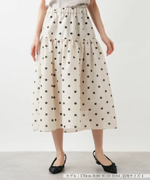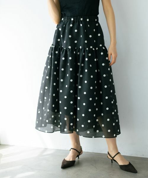 軽やかな薄手の生地にシンプルなドット柄を散りばめスカート。甘くなりすぎないデザインで、大人のカジュアルにも程よくなじむ一枚です。ウエストは総ゴム仕様で、締めつけ感のない快適なはき心地を実現。タックインすれば自然とウエストマークが際立ち、脚長見せ効果も期待できます。裾に向かってふんわりと広がるシルエットが、歩くたびに優雅な揺れ感を生み、女性らしいムードを引き立てます。Tシャツやブラウスを合わせるだけで、季節らしい着映えるスタイルが完成します。