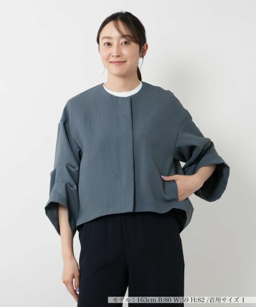 立体的なスリーブデザインが印象的な、モードな雰囲気漂うノーカラージャケット。前立ては比翼仕立てでミニマルに仕上げ、洗練された印象を引き立てます。フロントのスナップボタンで開閉が可能です。身幅にゆとりを持たせたボックスシルエットは、動きやすさとこなれ感を両立。残誤差のある程よい着丈で、パンツもスカートもバランス良く決まります。デザイン性がありながらも、合わせるアイテムを選ばず、オフィスから週末のお出かけスタイルまで幅広く活躍。1枚で着映えるジャケットです。