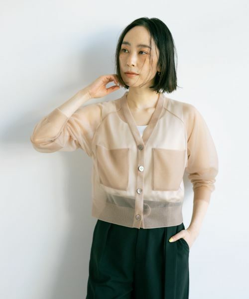 ほんのり透ける素材感が軽やかな印象のシアーカーディガン。透け感のある編地を用い、涼しげで春夏らしい装いを演出します。フロントの大きめなポケットがアクセントとなり、シンプルな中にもデザイン性をプラス。コンパクトな丈感でボリュームボトムとも好相性。羽織りとしてはもちろん、ボタンを留めてプルオーバー風にも楽しめる着回し力の高い一枚です。きれいめパンツやスカートと合わせて、品のある大人カジュアルコーデがおすすめです。