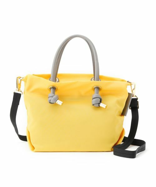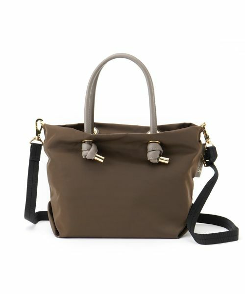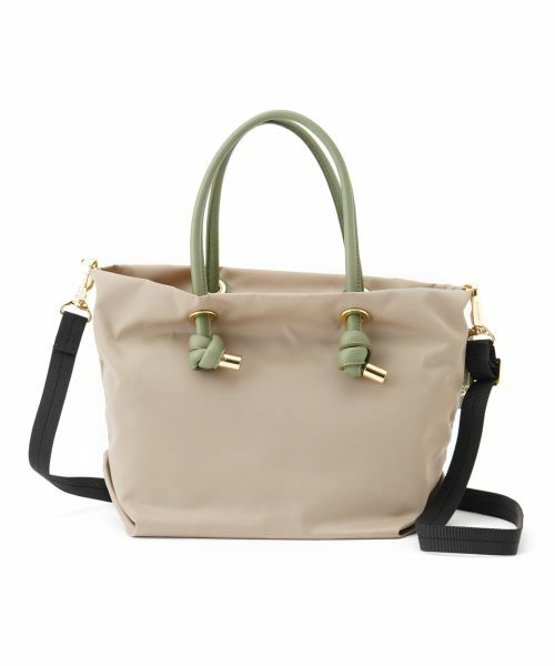 やさしいカラーリングに持ち手の配色が映える、ナイロン素材の2WAYバッグ。艶を抑えたマットな質感が上品で、軽やかな季節感を添えてくれます。フロントには結び目のディテールとゴールドパーツが施され、アクセントとしても優秀。手持ちとショルダー、どちらでも使える2WAY仕様で、通勤から休日まで活躍の場が広がります。しっかりとマチがありながらも軽量で、デイリーに使いやすい頼れるアイテムです。