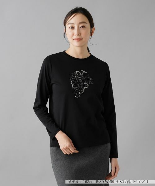 胸元に施された刺繍とスパンコールで表現されたブドウモチーフが印象的なトップス。立体的なモチーフが、シンプルなデザインにエレガントなアクセントを加え、さりげない存在感を演出します。コットン100%の素材が肌に優しくフィットし、デイリーユースに最適。落ち着いたカラー展開なので派手になりすぎず、大人の余裕を感じさせるスタイルに仕上げます。一枚で主役になれるアイテムとして、カジュアルからエレガントまで幅広く活躍します。